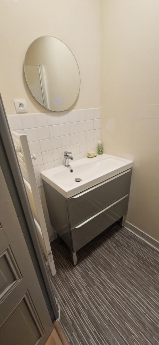 Entrée, cuisine aménagée équipée (hotte -four -plaques) ouverte sur séjour, couloir, placard, wc, salle d’eau avec miroir led, vasque, sèche serviette, douche, deux chambres dont une petite.