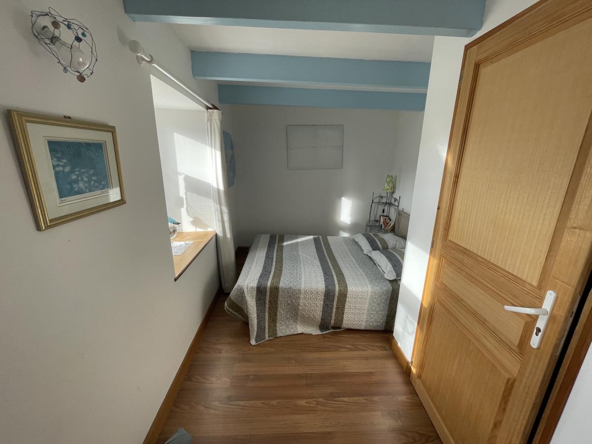 Gite 1 de 62m²: Entrée sur séjour avec cuisine aménagée équipée, salle d'eau, wc. A l'étage: palier, deux chambres dont une avec terrasse vue mer.