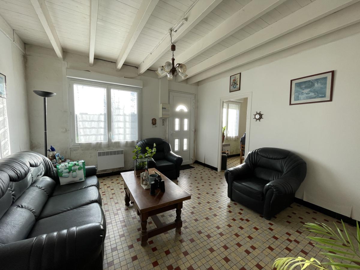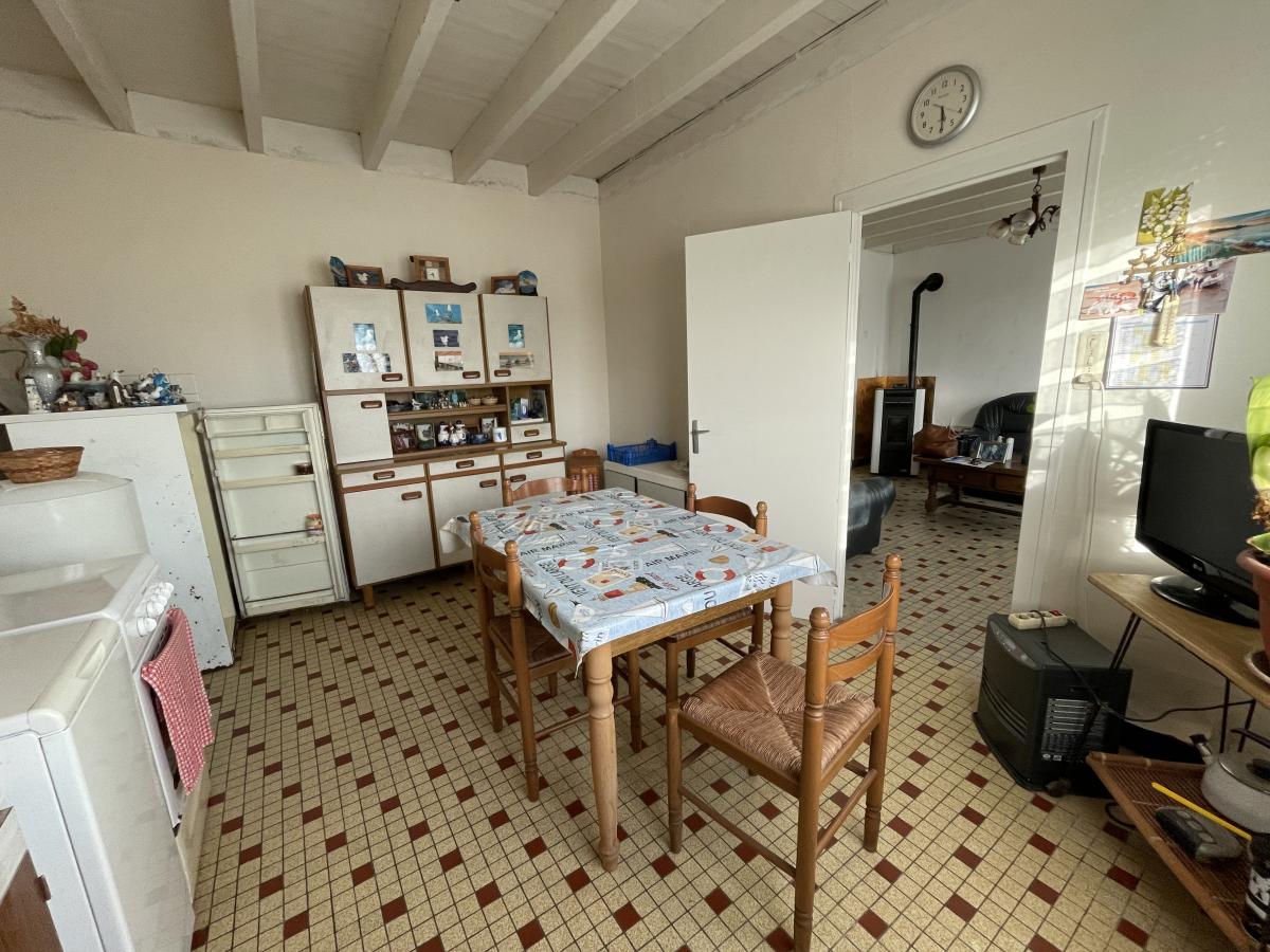 Maison mitoyenne composée de : séjour-salon avec poêle à pellets, cuisine, sas, wc, salle de bains, sortie sur l'arrière.